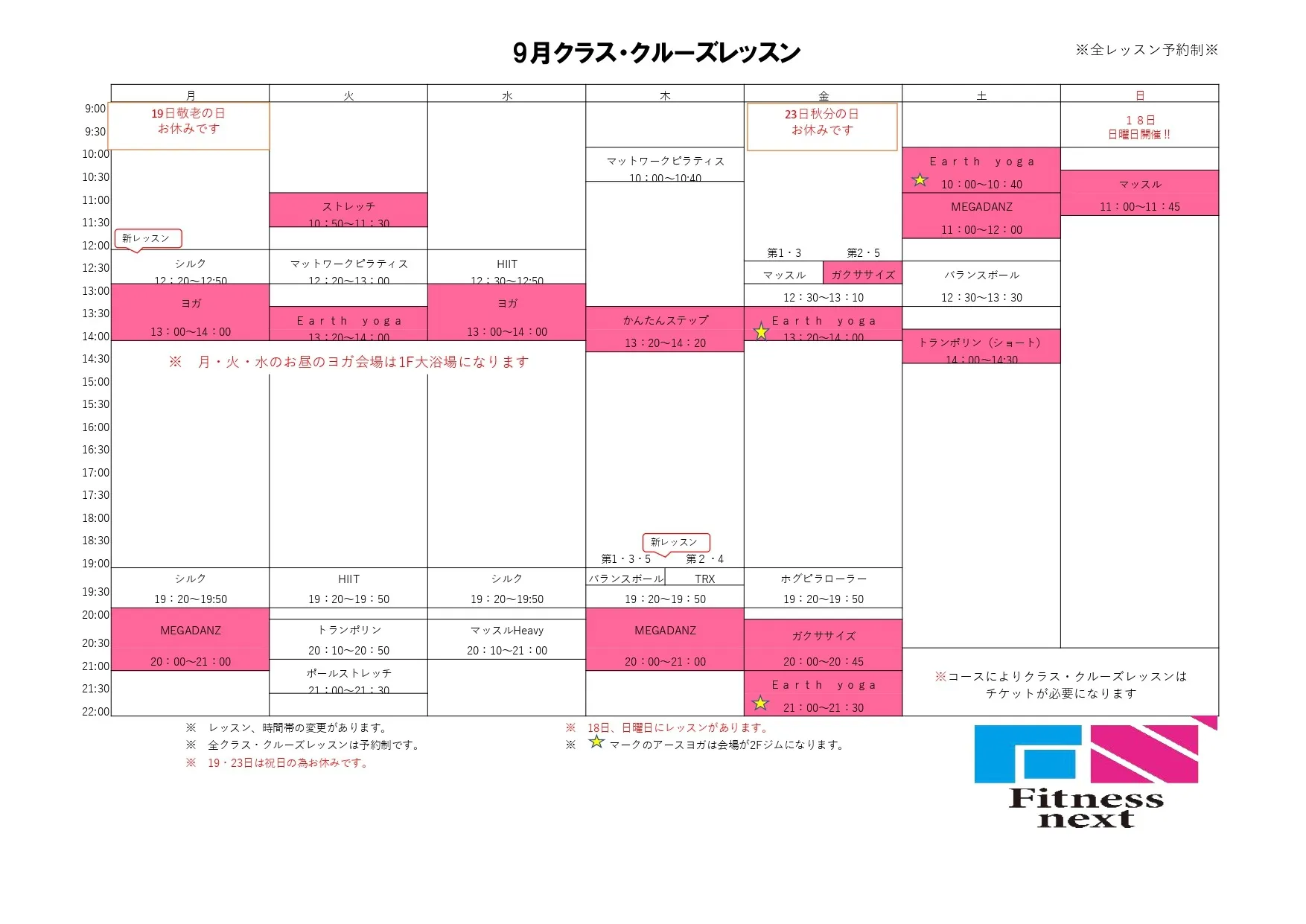 次月レッスンスケジュール 2022/08/19 9月レッスンスケジュール 9月のレッスンではお昼にはシルクトレーニング復活。 担当は小林トレーナー ^^ そして夜のレッスンにはバランスボール・TRXトレーニングも新たに 更に土曜日にトランポリンレッスンが登場です!! 予約は8月20日土曜日よりスタート☆ ご予約お待ちしております(^^)/