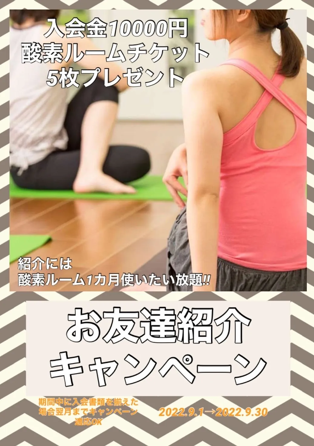 紹介キャンペーン 2022/08/22 紹介キャンペーン 酸素1か月無料!! お友達の御紹介で酸素ドームが1か月使いたい放題(体験も含む) 更に入会者の紹介で会費1ケ月半額!! キャンペーン期間は9月1日(木)~9月30日(金) 体験・入会 どちらでもOK ご紹介で酸素ルームが 1ヶ月使いたい放題。さらに予約も取り放題!! ご紹介お待ちしております(^^)/