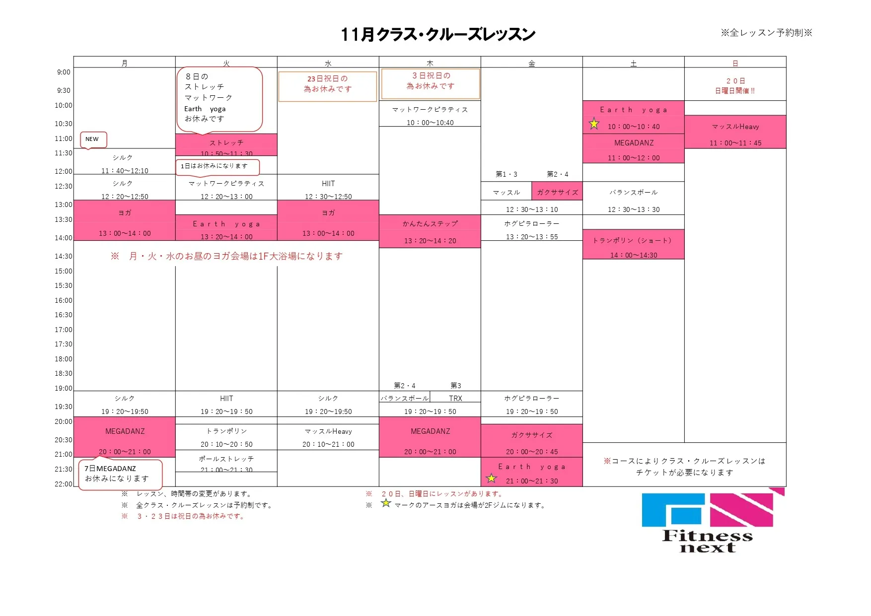 11月スタジオレッスン 2022/10/20 11月スタジオレッスン 今日から次月の予約がスタートです!! 次月レッスン休校日 ・11月1日 マットワークピラティス ・11月7日 MEGADANZ ・11月8日 ストレッチ、マットワークピラティス、Earthyoga ・祝日お休みです 以上の日程がお休みです。予約お待ちしております(^^)/