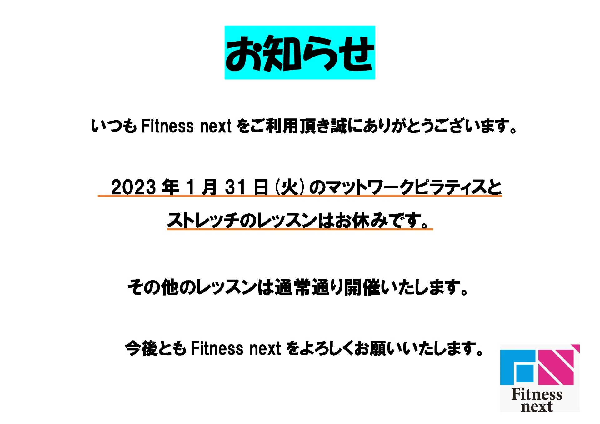 2023年1月レッスン一部変更のお知らせ 2022/12/27 タイトル サブタイトル いつもFitnessnextをご利用頂き誠にありがとうございます。 1月31日(火)のマットワークピラティスとストレッチはお休みです。 その他のレッスンはレッスン表の通りに開催いたします。 今後ともFitness nextをよろしくお願いいたします。