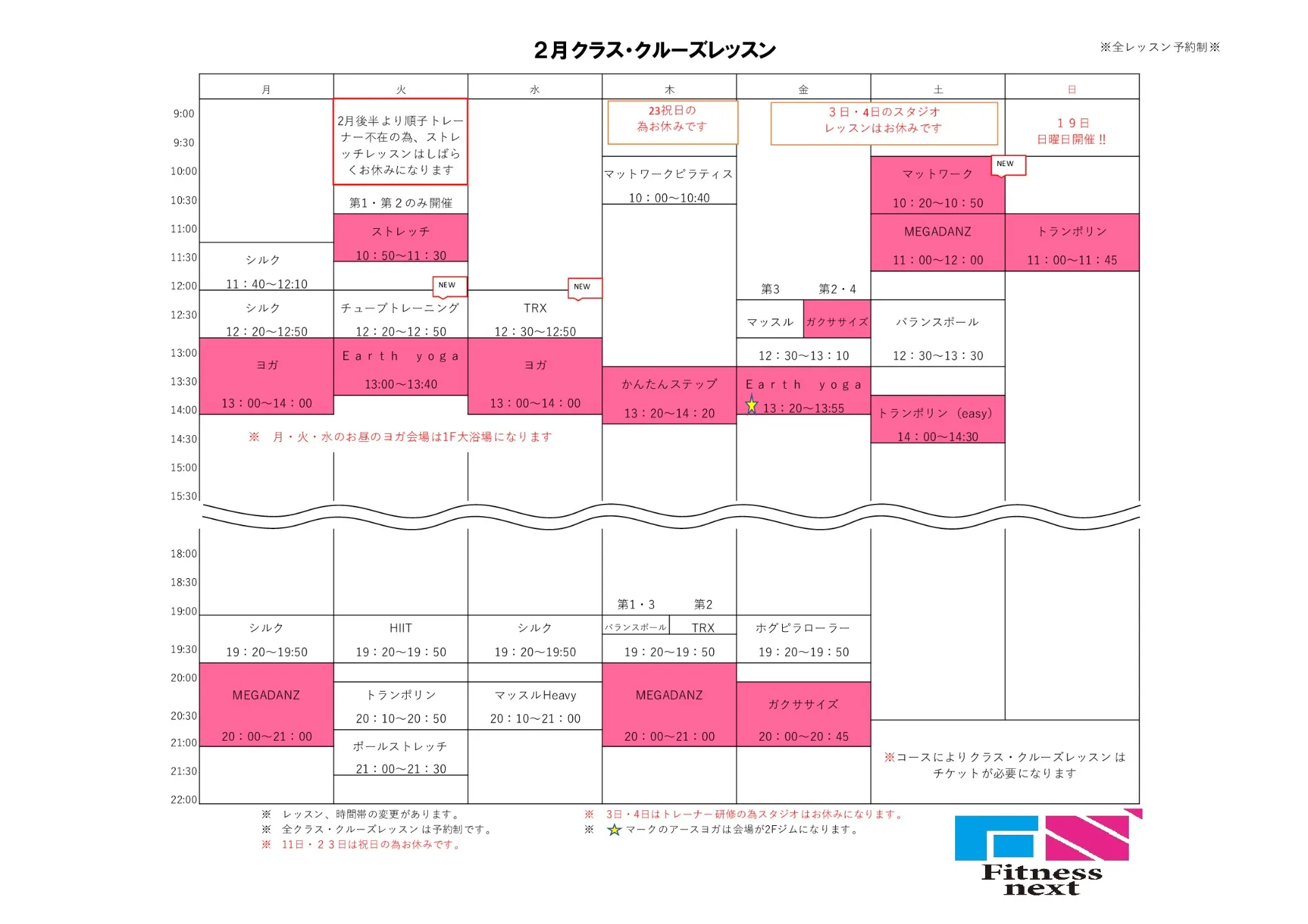 次月レッスンスケジュール 2023/01/19 2月スケジュール 速いものでもう1月も終わります。明日より2月のトレーニング予約スタート!! 2月一杯で順子トレーナーがしばらくお休みをいただきます。 順子トレーナーのレッスン、ピラティスはお早めにご予約を(^^)