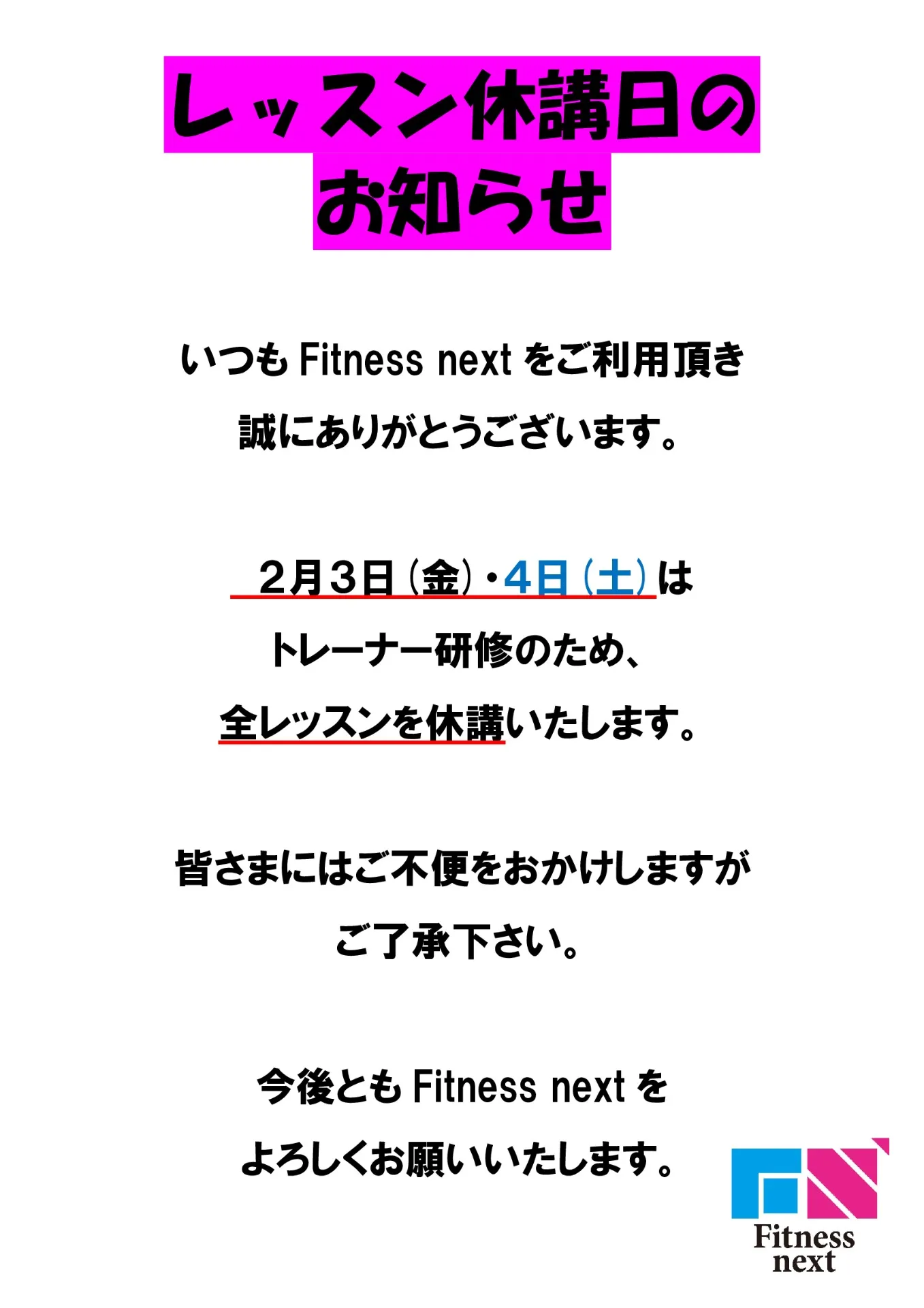 2023/01/20 2月レッスンのご案内 いつもFitness nextをご利用頂き誠にありがとうございます。 2月3日(金)・4日(土)トレーナ研修の為 クラスレッスンはお休みとさせていただきます。 パーソナルトレーニング、サテライトスタジオは ご利用頂けますがグリーンホテルスタジオは研修場所になる為 ご利用頂けませんのであらかじめご了承ください。