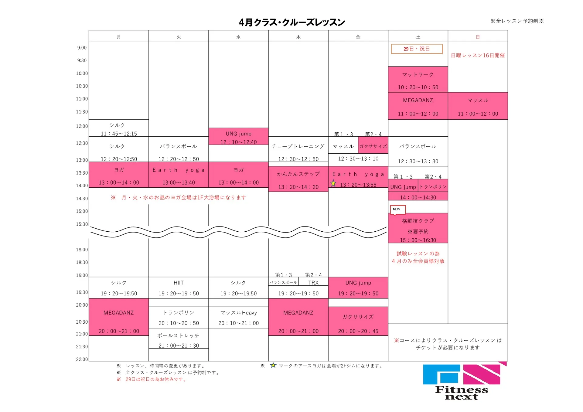 次月レッスンスケジュール 2023/03/18 4月レッスンスケジュール サブタイトル いつもFitness nextをご利用頂き誠にありがとうございます。 4月のレッスンスケジュールです。 レッスン時間変更や新たなレッスンがスタートします。 込み合いますのでお早目のご予約お待ちしております。