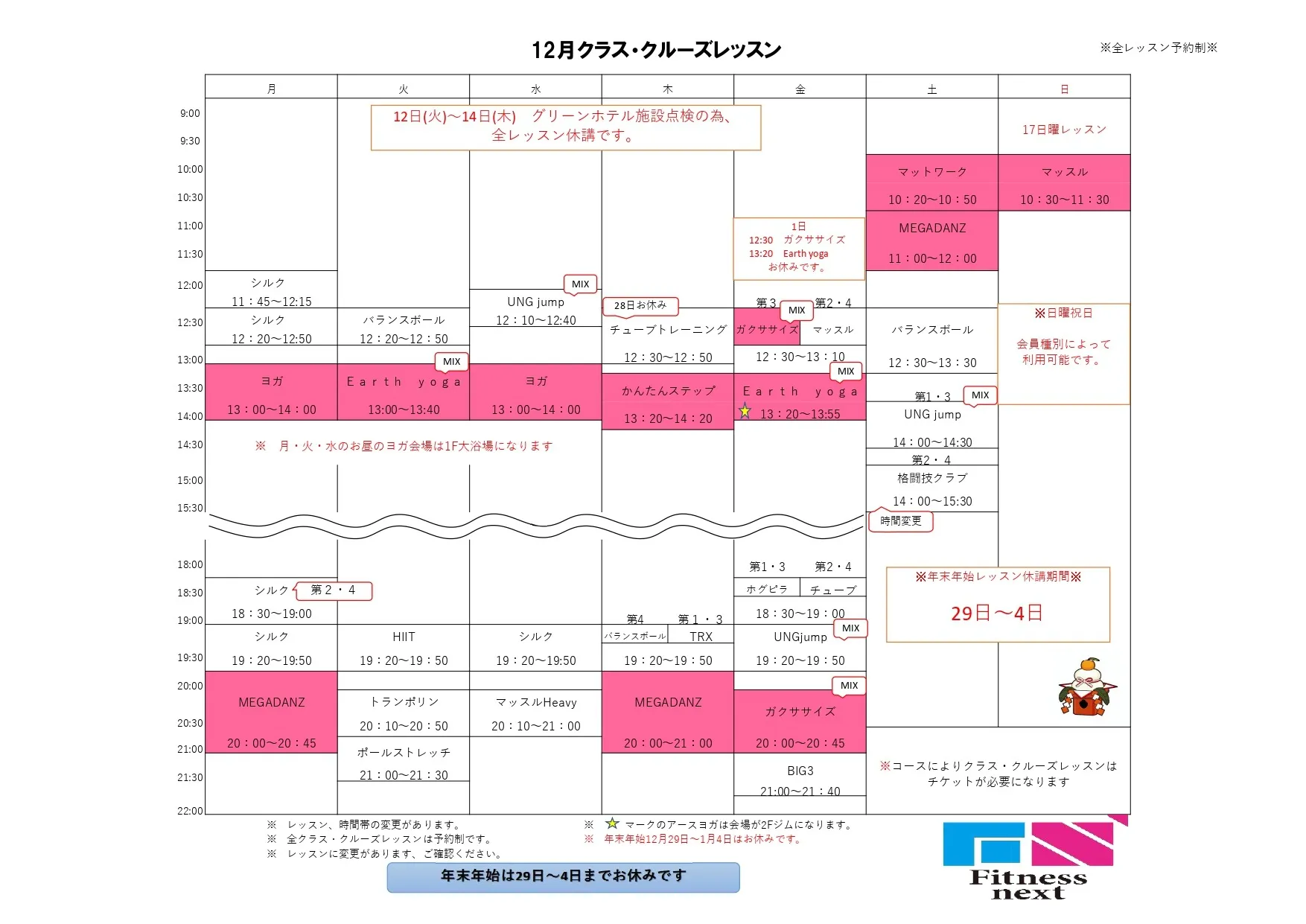 12月レッスン 2023/11/17 次月レッスンスケジュール いつもFitness nextをご利用頂き誠にありがとうございます。 12月のレッスンスケジュールになります。12月はグリーンホテル施設点検の為 スタジオのみお休みの日があります。ご確認お願いします。