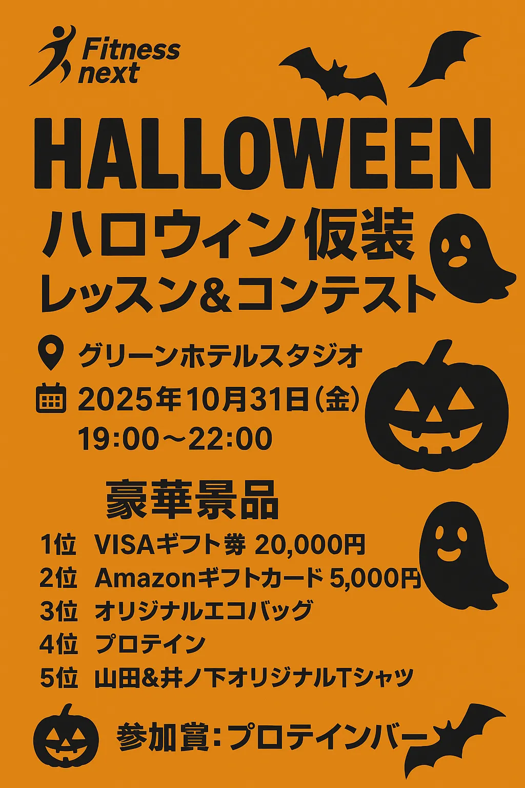 ハロウィン仮装レッスン開催 いつもFitnessnextをご利用いただき誠にありがとうございます。10月31日はハロウィン!仮装をしてもしなくても特別なダンスレッスンでしっかり身体を動かしましょう!!会員種別関係なく参加は自由・…