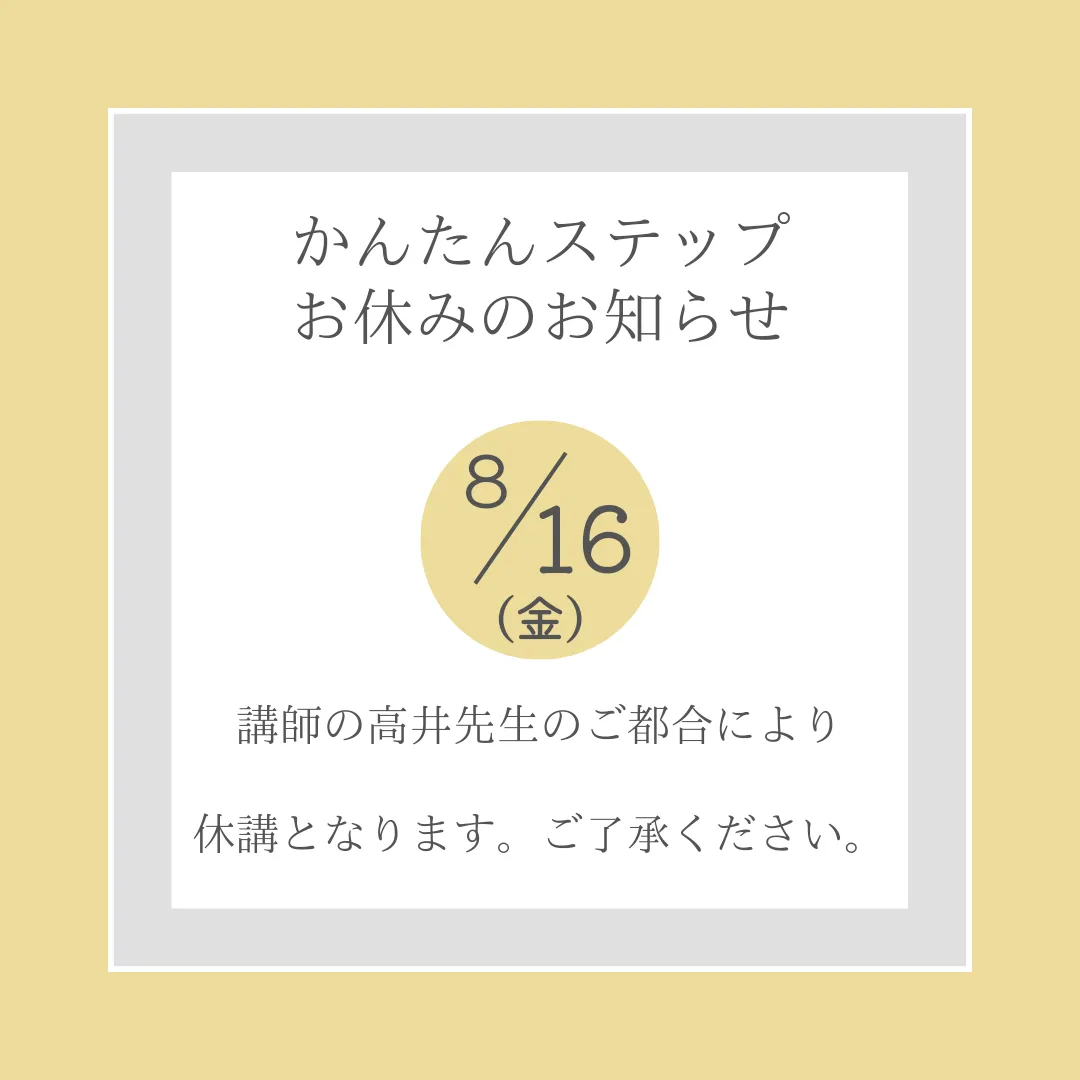 休講レッスンのお知らせ 8月16日(金)のかんたんステップは休講になります。いつもFitnessnextをご利用いただき誠にありがとうございます。レッスン休講のお知らせです。8月16日(金)13:30~のかんたんステップは、講師の高井先生…