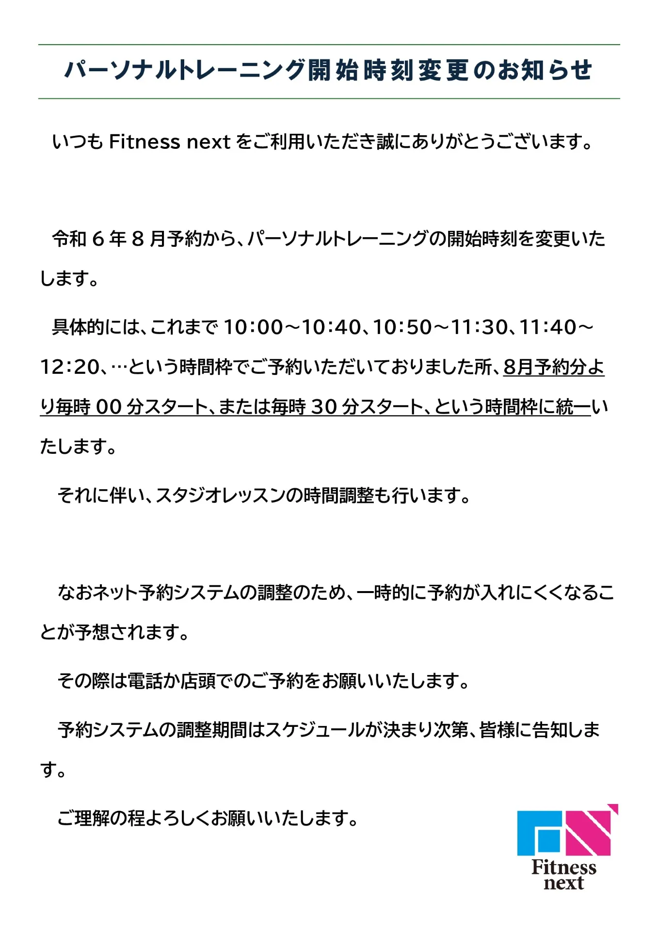 ネット予約受付一時停止のお知らせ いつもFitnessnextをご利用いただき誠にありがとうございます。以前より告知しておりました通り、8月よりパーソナルトレーニングの開始時刻を毎時00分と毎時30分に変更いたします。その調整のため、7月…