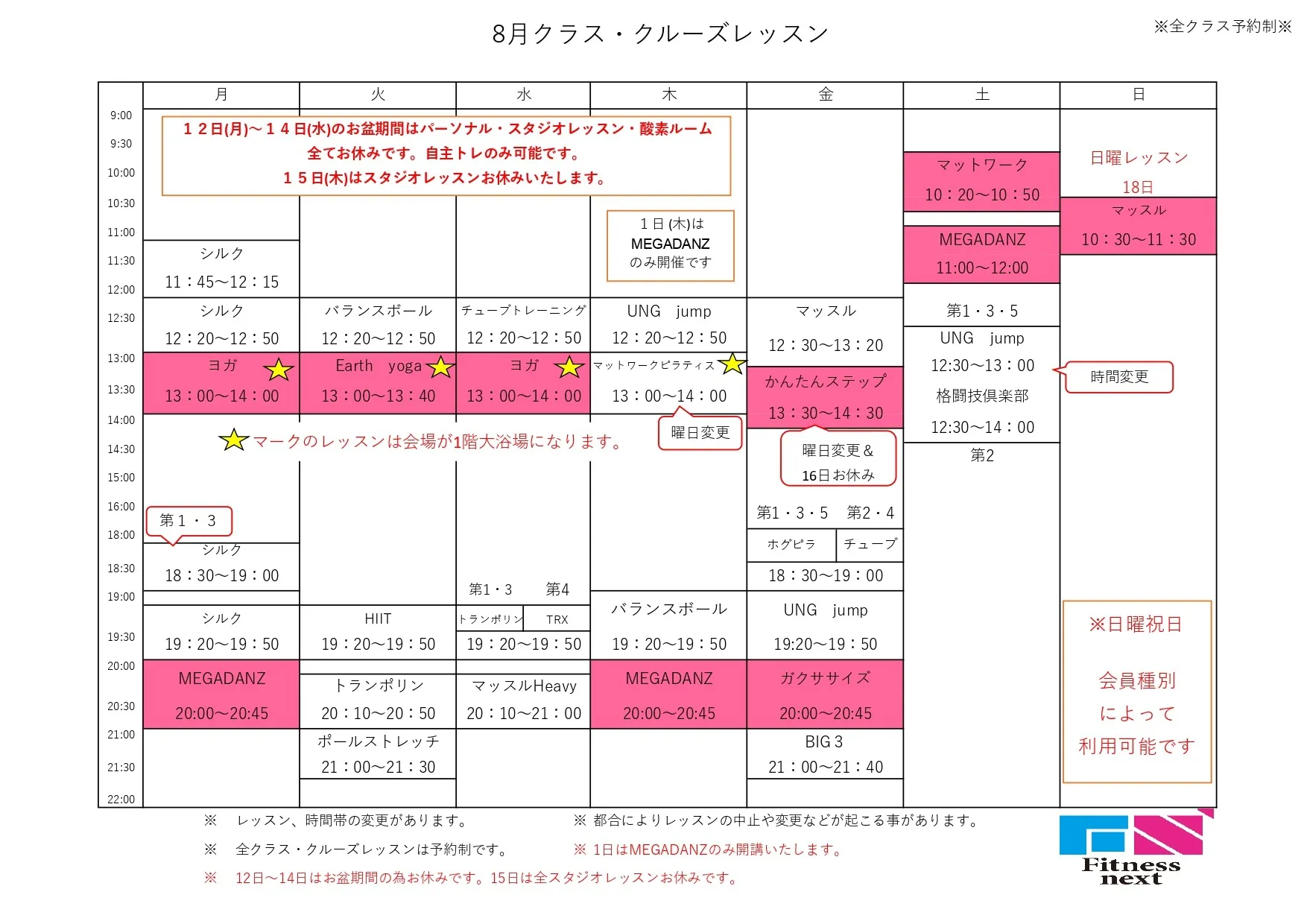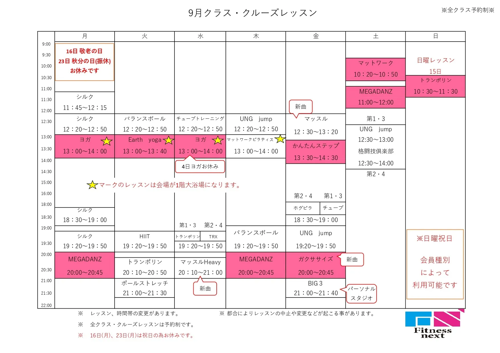 レッスンスケジュール いつもFitnessnextをご利用頂き誠にありがとうございます。9月のレッスンスケジュールになります。25日予約日は回線が込み合います。予約しずらい時間帯がありますのでよろしくお願いします。