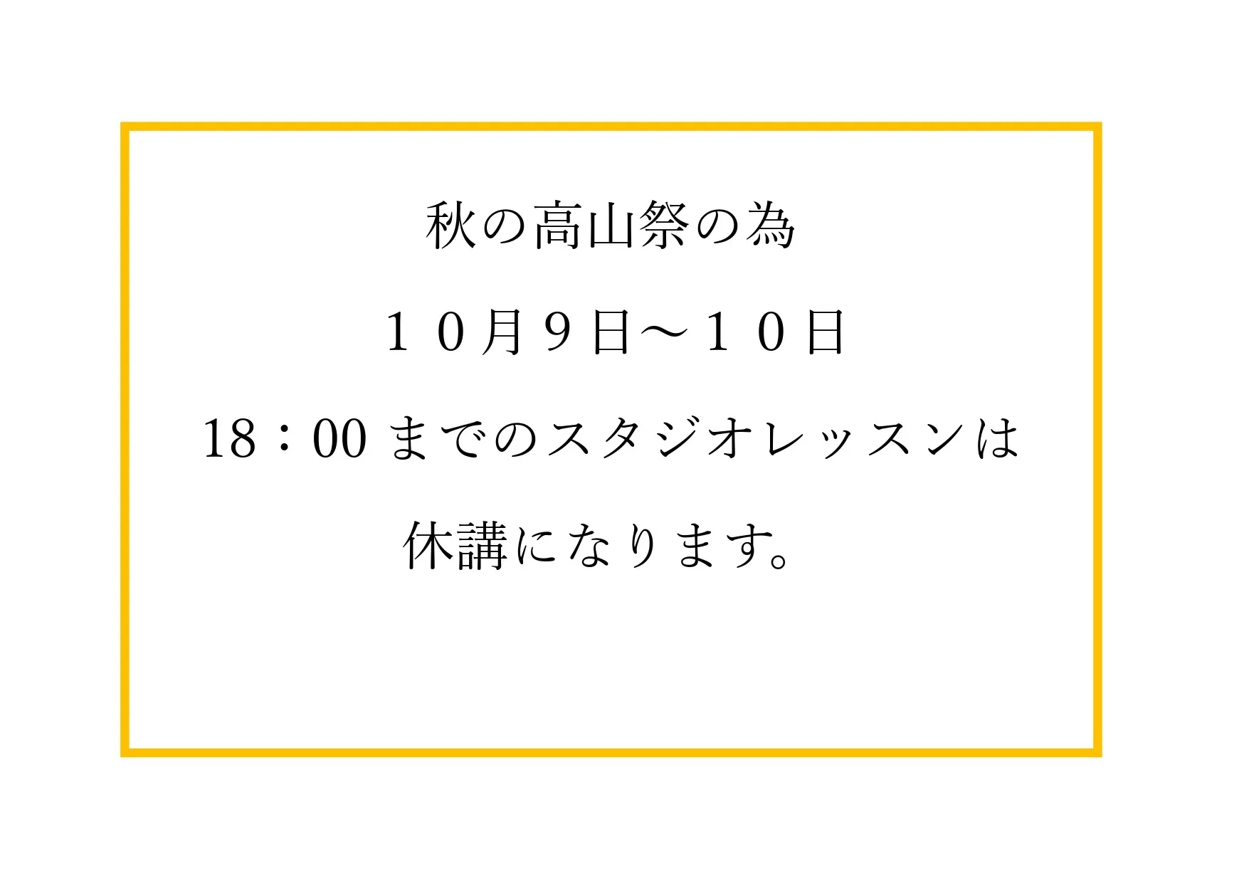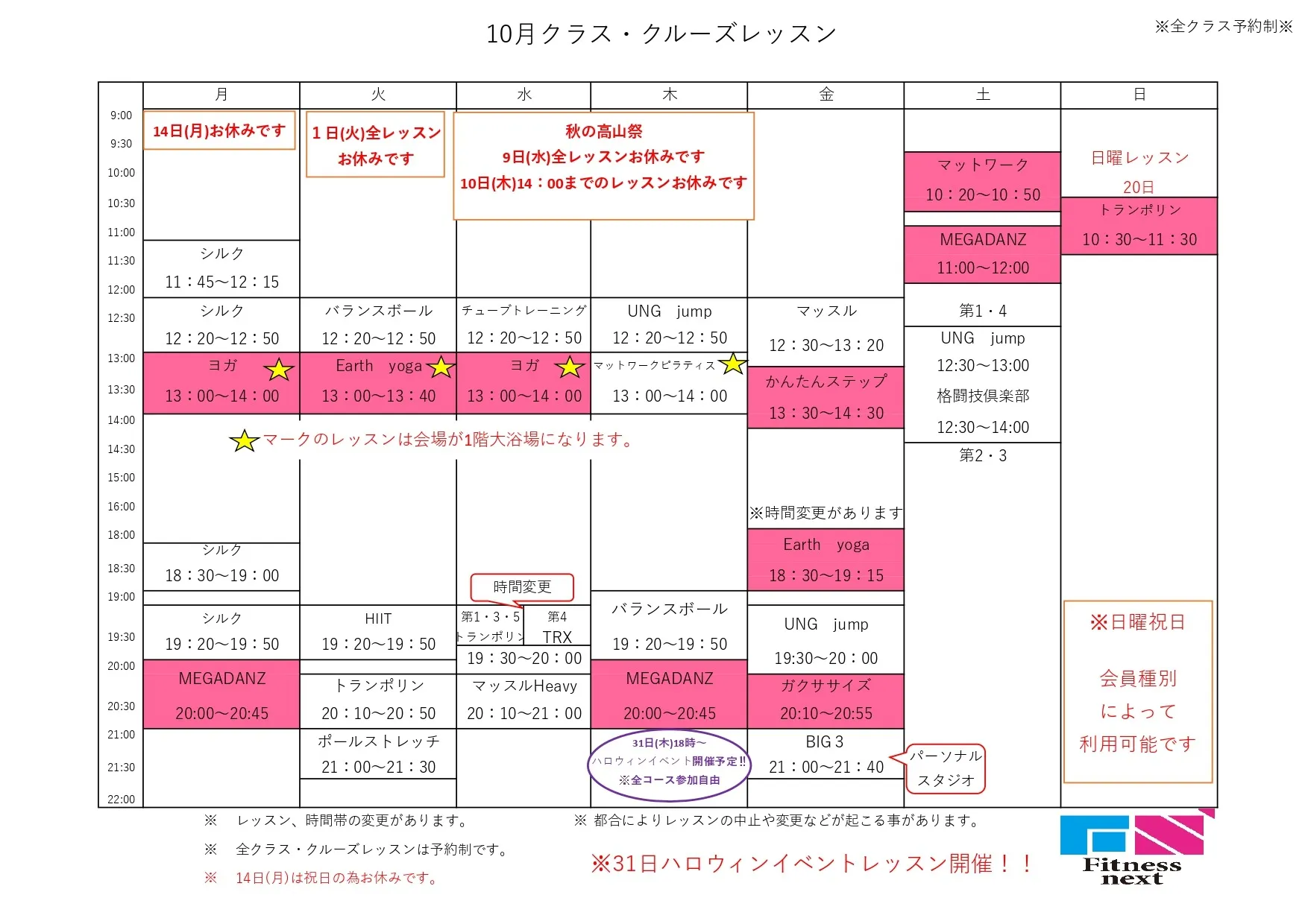 レッスン休講のお知らせ いつもFitnessnextをご利用いただき誠にありがとうございます。10月9日~10日18:00までは秋の高山祭の為、スタジオレッスンは休講になります。皆様、お間違えの無いようお願いいたします。