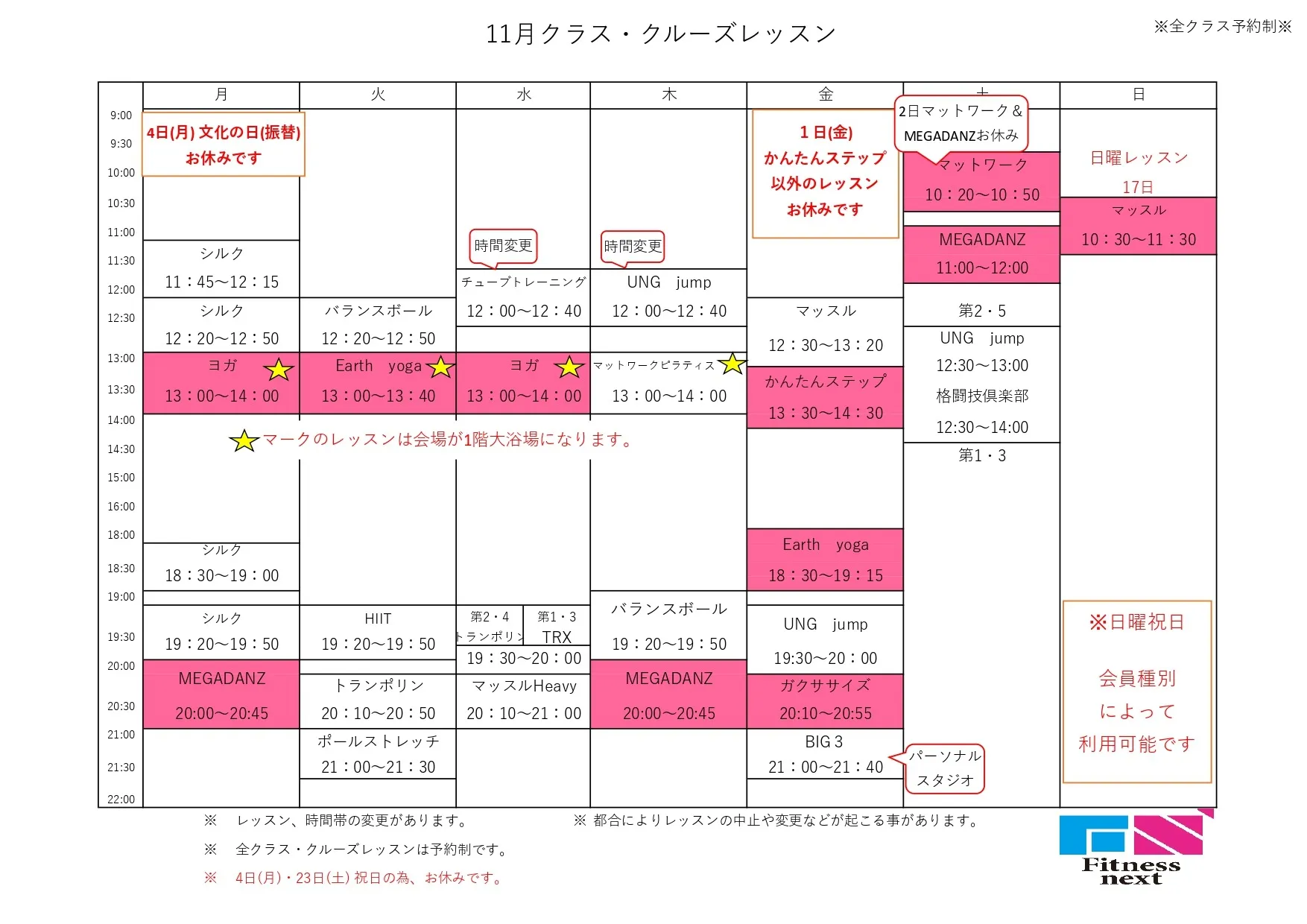 2024年11月レッスンスケジュール いつもFitnessnextをご利用いただき誠にありがとうございます。11月レッスンスケジュールを公開いたしました。休講レッスン・時間変更がありますのでご確認ください。【休業日】毎週日曜、4日(月)、23日(…